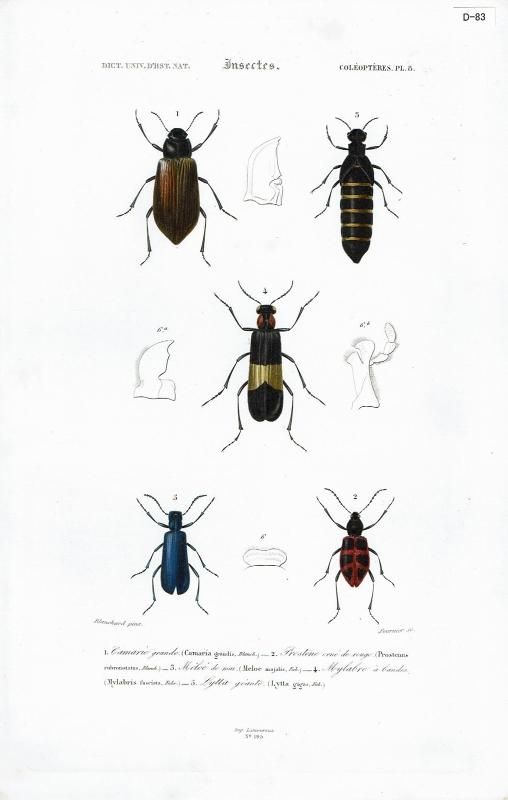 D'Orbigny『Dictionnaire universel d'histoire naturelle』(1860)より、ツチハンミョウなど、雑甲虫の図。手彩色銅版画(フランス)。約275×177mm。