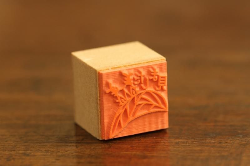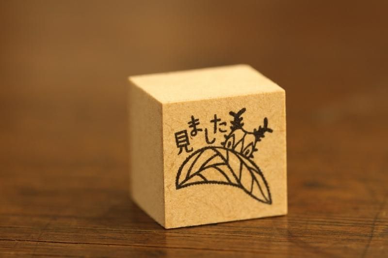 オオムラサキの幼虫が顔を出して「見ました」と言っているスタンプ。持ち手は21×21mm。