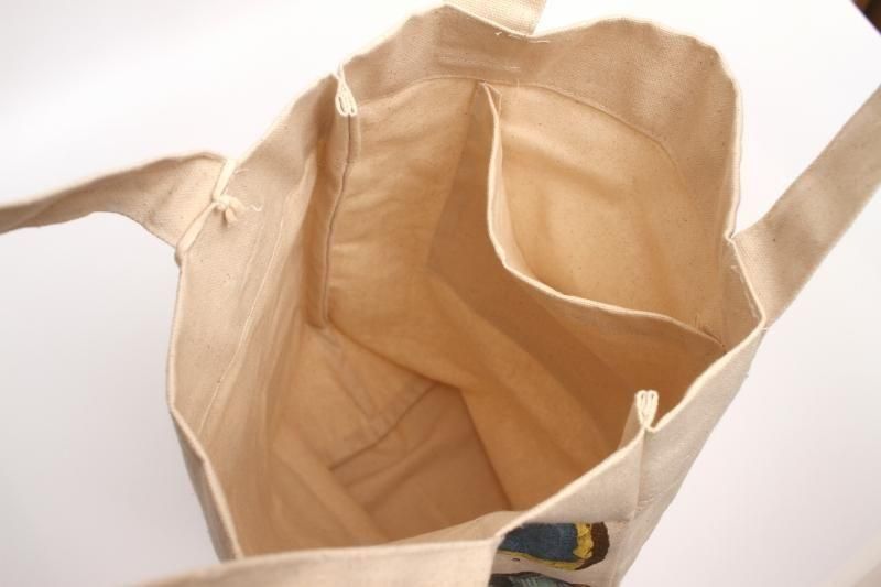 高さ約40cm、口幅約31cm、底マチサイズ18.5×15.5cm。綿100%。