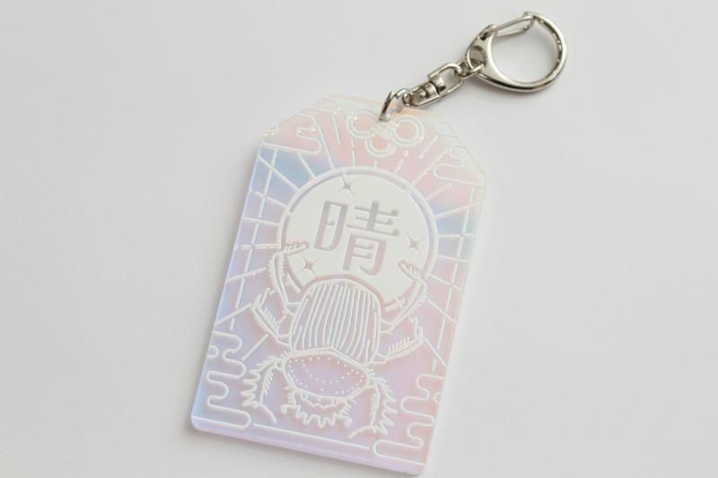 虫探しの日に雨はつらい…。太陽神の象徴、スカラベにお願いしよう! オーロラ加工で角度によって色が変わるアクキーです。