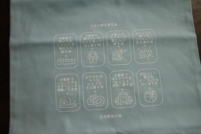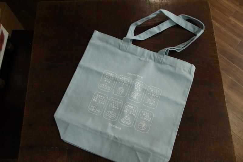 戻す会バッジが勢ぞろいしたデザインのトートバッグ。困っている生き物がいたら助ける、そんな意思表示ができるアイテムです。